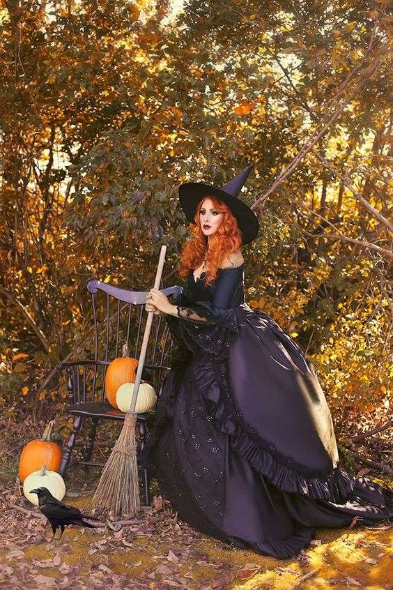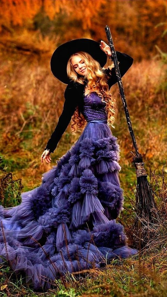For those looking to channel their inner fairy queen, this outfit is an absolute dream. The flowing purple dress, adorned with layers of ruffles and a fitted bodice, exudes elegance and grace. A wide-brimmed hat and a mystical broomstick complete the look, adding a hint of magical allure. The lush fabric and intricate details make this outfit perfect for an outdoor Halloween event or a whimsical garden party. The soft, romantic vibes of this look are perfect for women who want to feel ethereal and otherworldly. Pair it with soft curls and natural makeup for a complete fairytale transformation.