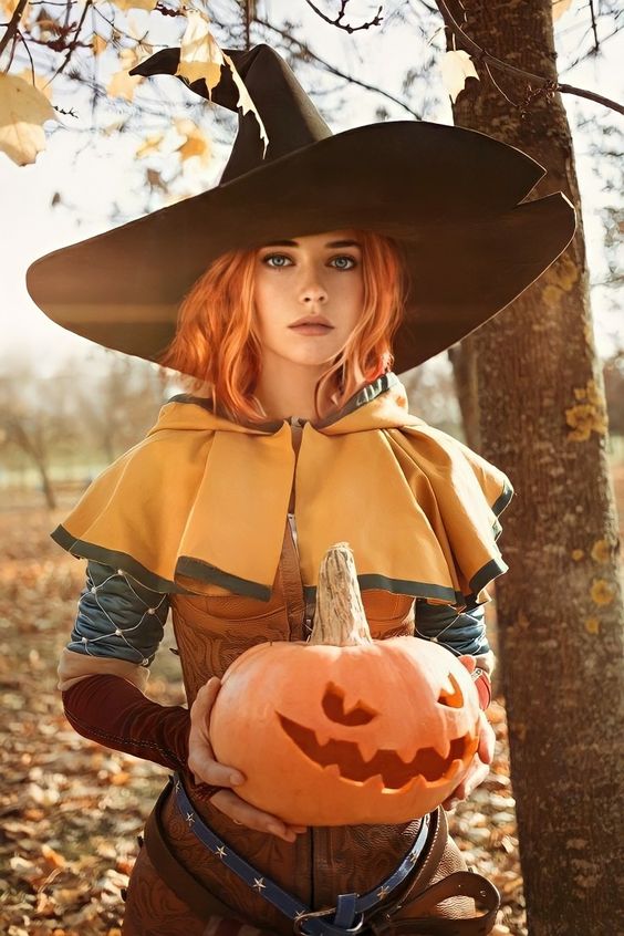 This charming pumpkin witch costume is perfect for those who love the harvest season. The outfit features a beautifully detailed bodice, a flowy skirt, and a warm-toned cape. The oversized witch hat adds a whimsical touch, while the carved pumpkin prop ties the look together. This costume is ideal for outdoor gatherings or a cozy fall celebration. The flannel and denim fabrics provide warmth, making it suitable for cooler weather. It’s a cute and classic choice for women looking to embrace the autumnal spirit.
