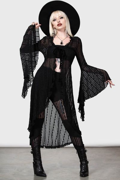 Step into a world of mystery with this gothic lace outfit. The long, flowing dress features intricate lace detailing and bell sleeves, giving it a dramatic and ethereal look. Paired with a wide-brimmed hat and dark lipstick, this outfit is perfect for those who love a dark and mysterious aesthetic. The lace fabric adds a touch of elegance, making it suitable for both fall and winter events. This look is ideal for women who appreciate a blend of gothic and vintage styles, perfect for a night of enchantment.