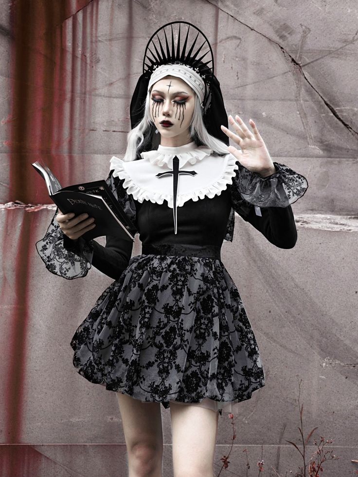 For a spooky and edgy Halloween look, consider this sinister nun costume. The outfit features a black and white dress with a lace overlay, a dramatic collar, and a headpiece that adds a haunting touch. The pale makeup and dark eye makeup complete the eerie look, making it perfect for a Halloween party or a themed event. The lace and velvet fabrics provide a luxurious feel, making it an excellent choice for a more formal Halloween gathering. This outfit is great for women who love to combine elegance with a hint of the macabre.