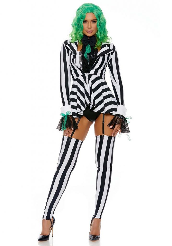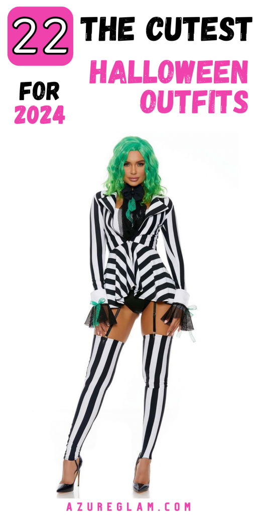 For a modern and sleek Halloween look, this striped outfit is a perfect choice. The black and white stripes are reminiscent of classic horror films, while the fitted silhouette and green wig add a contemporary twist. The outfit includes a high-neck top, leggings, and a peplum jacket, creating a cohesive and stylish ensemble. The mesh accents add texture and depth, making this look perfect for a Halloween party or a night out. It’s an ideal choice for women who want to dress to impress and stand out with a bold and edgy style.