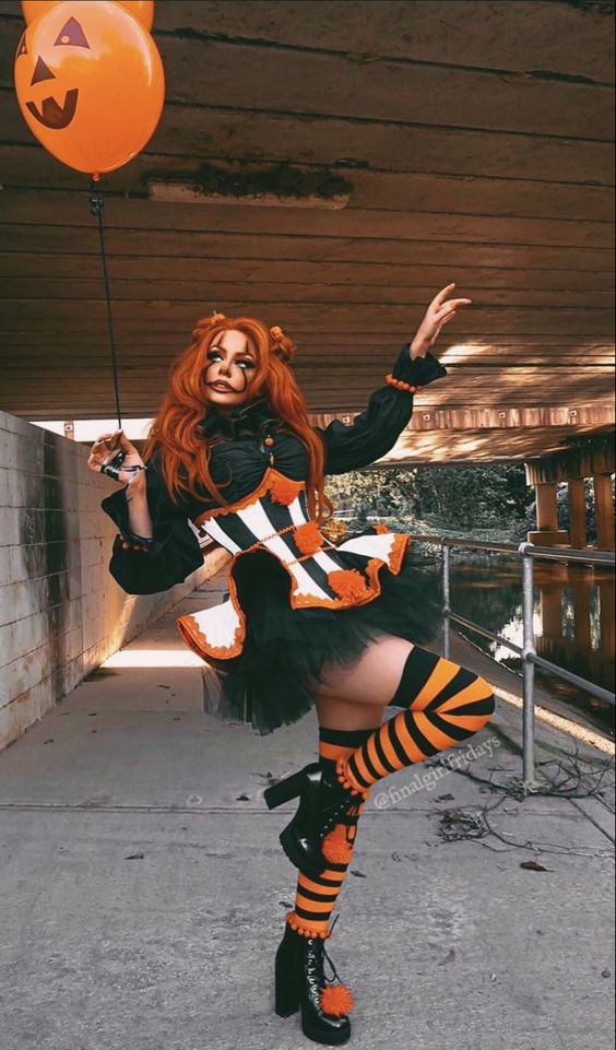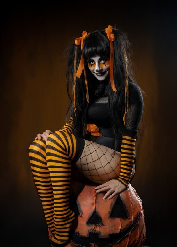 Get into the Halloween spirit with a fun and flirty outfit inspired by pumpkins! This ensemble features a vibrant black and orange striped dress, matching thigh-high stockings, and playful pigtails adorned with orange ribbons. The playful makeup and a cute pumpkin prop complete the look, making it an ideal choice for those who want to add a touch of whimsy to their Halloween attire. The use of mesh and lace in the outfit adds a modern edge, while the bright colors ensure you stand out in any crowd. This is a great choice for casual parties and is perfect for women who love to embrace the festive vibe of the season.