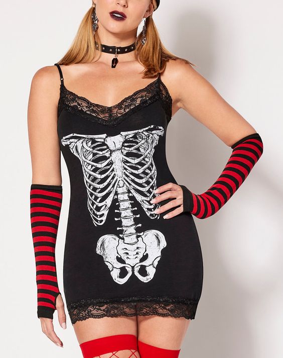 Add a playful twist to the classic skeleton look with this chic mini dress featuring a skeleton print. The outfit is accessorized with striped arm warmers and red fishnet stockings, creating a fun and flirty vibe. This costume is perfect for a night out or a casual Halloween party. The lightweight fabric makes it comfortable for dancing and mingling, while the simple yet striking design ensures you stand out. It’s an easy and stylish choice for women looking for a casual Halloween outfit.