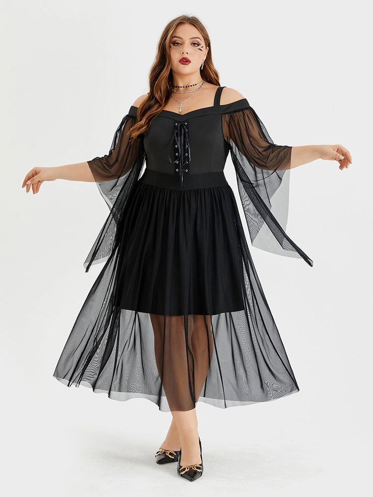 For a modern take on the classic witch costume, consider this elegant black dress with lace sleeves and a flowing hemline. The outfit is complemented by a wide-brimmed hat and minimal accessories, allowing the intricate details of the dress to shine. This look is perfect for those who appreciate a refined and sophisticated Halloween style. The lace and mesh fabrics give the costume a delicate and ethereal quality, making it suitable for both casual and formal events. It’s a timeless choice that captures the essence of witchy glamour.
