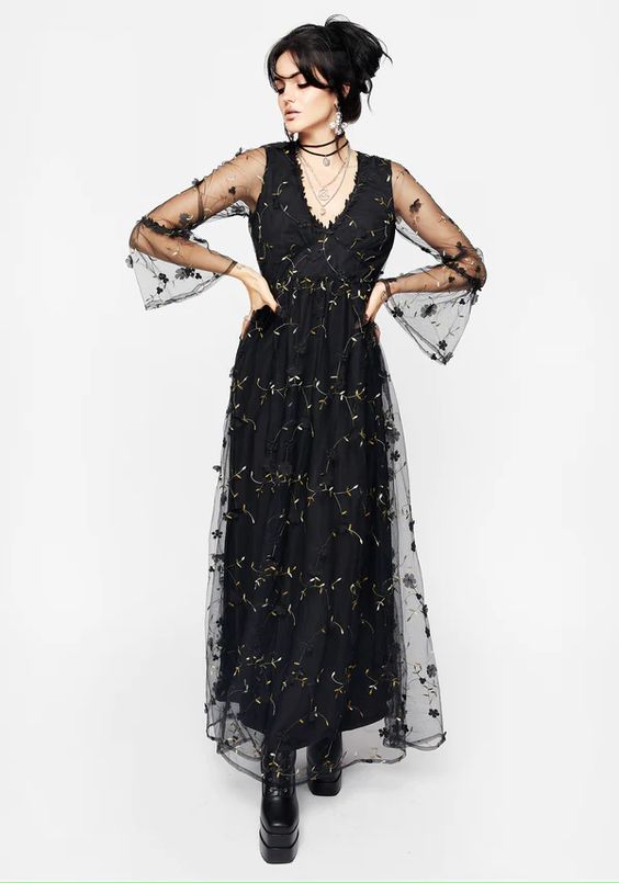 For a sophisticated yet spooky look, opt for this stunning gothic ensemble. A long, black dress with sheer, bell sleeves and delicate floral embroidery provides a chic and elegant vibe. The intricate lace details add a touch of vintage glamour, making it perfect for those who appreciate classic gothic aesthetics. This outfit is versatile enough for both fall and winter events, offering a timeless elegance that’s perfect for formal Halloween gatherings or a stylish night out. Accessorize with statement jewelry and dark, dramatic makeup to complete the look. It’s a beautiful choice for women who want to combine elegance with a hint of mystery.