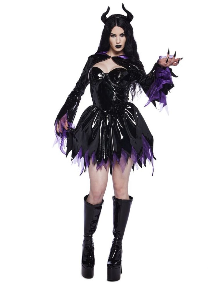 Channel your inner dark fairy tale character with this captivating outfit. The shiny, black dress with a high-low hemline and dramatic, pointed sleeves gives a mystical and enchanting feel. The outfit is accentuated with purple details, adding a regal touch. The addition of dark makeup and horned headpiece completes the look, perfect for women who want to embrace their darker side with a touch of fantasy. This outfit is great for both Halloween parties and cosplay events, offering a unique and eye-catching option that stands out from traditional costumes. The use of shiny fabrics like leather and velvet adds to the outfit’s allure, making it perfect for those who love a bit of glamour and mystery.