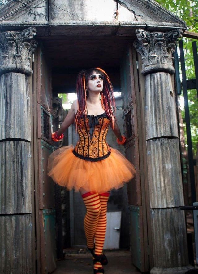 Step into a colorful and whimsical world with this vibrant Halloween doll outfit. The bright orange tutu, paired with a detailed corset and striped stockings, creates a playful and energetic look. The bold makeup and intricate accessories add a touch of theatrical flair, making it perfect for those who love to be the life of the party. This outfit is ideal for women who want to showcase their fun and creative side, with a unique twist on traditional Halloween colors. The use of vibrant fabrics and playful details makes this a standout choice for any Halloween event. It’s a great way to express individuality and have fun with fashion during the spooky season.