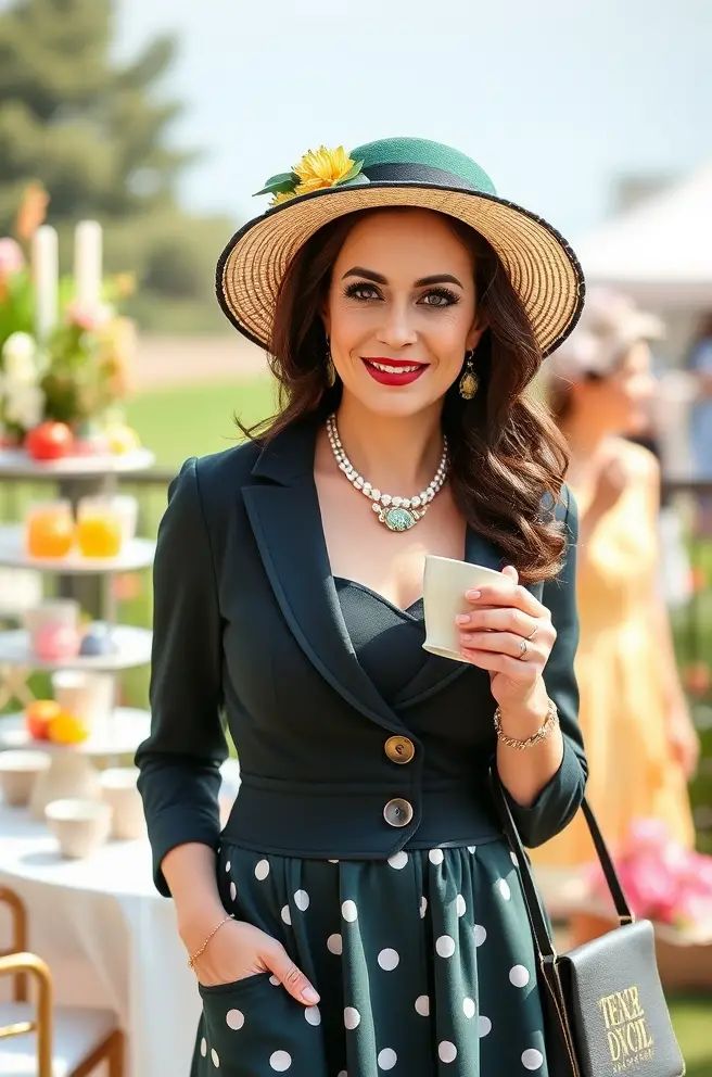 Nothing captures vintage sophistication quite like a classy polka-dot dress paired with a structured blazer. This winter casual ensemble, accentuated with pearl accessories and a wide-brimmed hat, exudes timeless charm. The deep green hue is perfect for an autumn high tea, offering warmth and grace. The fitted bodice and flared skirt create a flattering silhouette, ideal for a London-inspired tea party.