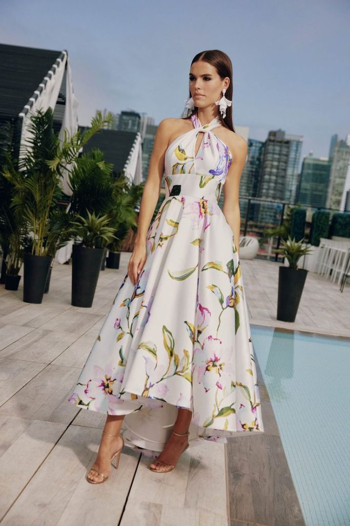 This modern halter-neck dress features an asymmetrical high-low hemline, making it a bold yet classy choice for a high tea gathering. The watercolor floral print enhances its ethereal charm, while the tailored bodice adds structure to the flowing skirt.