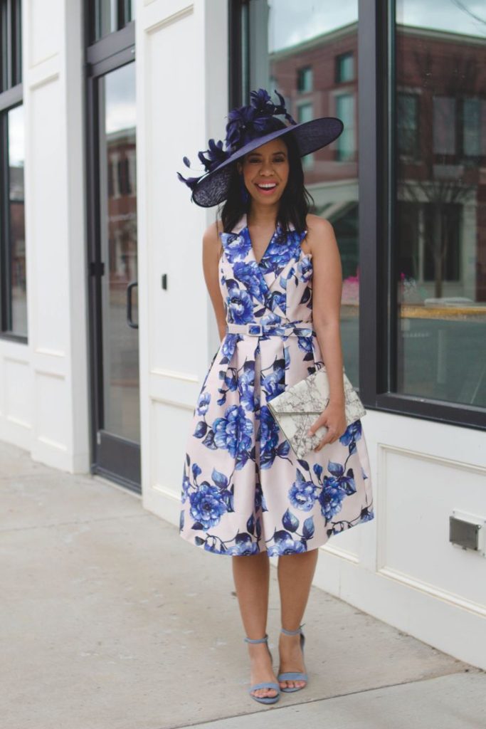 For those who appreciate floral prints, this blue-and-white fit-and-flare dress is an absolute showstopper. The structured bodice enhances the waistline, while the full skirt exudes elegance. A statement navy hat completes the regal look, perfect for a Christmas or wedding tea gathering.