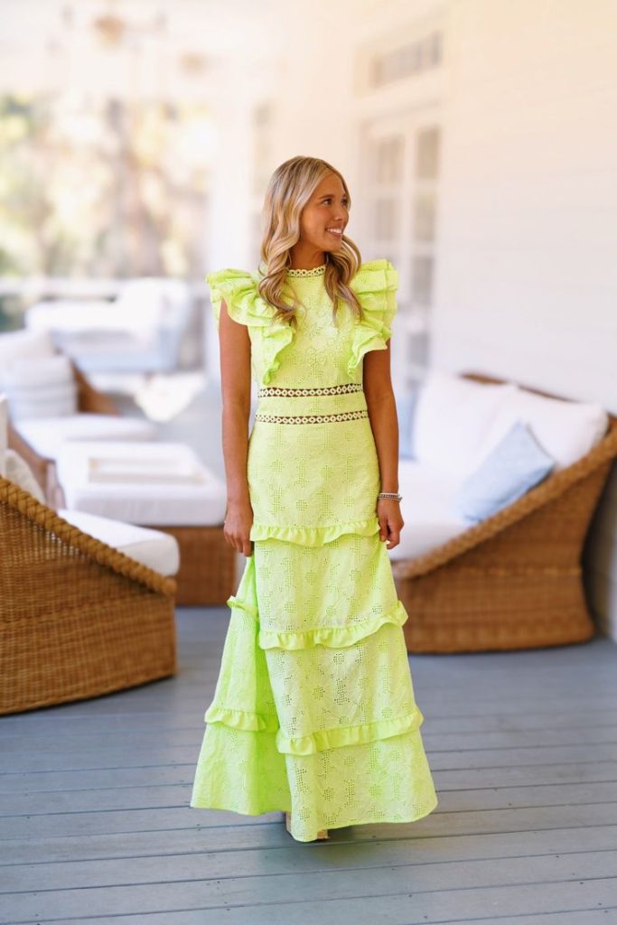 For a bold spring statement, this neon lime-green dress with structured ruffles offers a striking yet elegant choice. The fitted bodice and flowing skirt create an elongated silhouette, while the eyelet lace detailing adds a delicate touch.