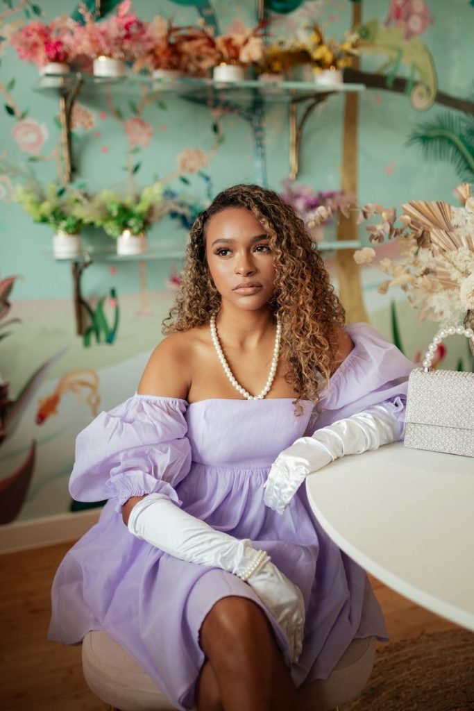 For those who prefer a modern yet vintage aesthetic, this puffed-sleeve dress in lavender makes a bold yet elegant statement. The winter elegant silhouette, with its structured bodice and voluminous sleeves, is perfect for a glamorous party setting. Long gloves and pearls channel a classic London high tea charm.