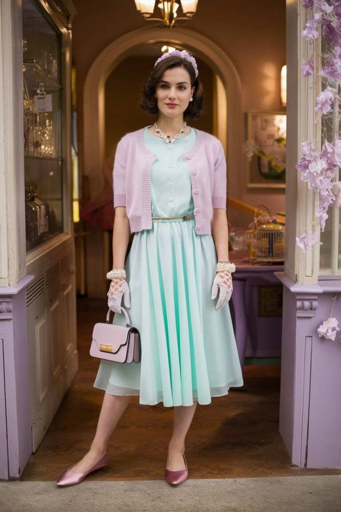 A quintessential vintage look, this pastel mint dress with a blush pink cardigan is the epitome of soft femininity. The fitted waist and flowing skirt create a graceful silhouette, while delicate lace gloves add an air of old-world charm. The pearl accessories and blush-toned flats keep the ensemble classy, making it perfect for spring or summer casual high tea events.