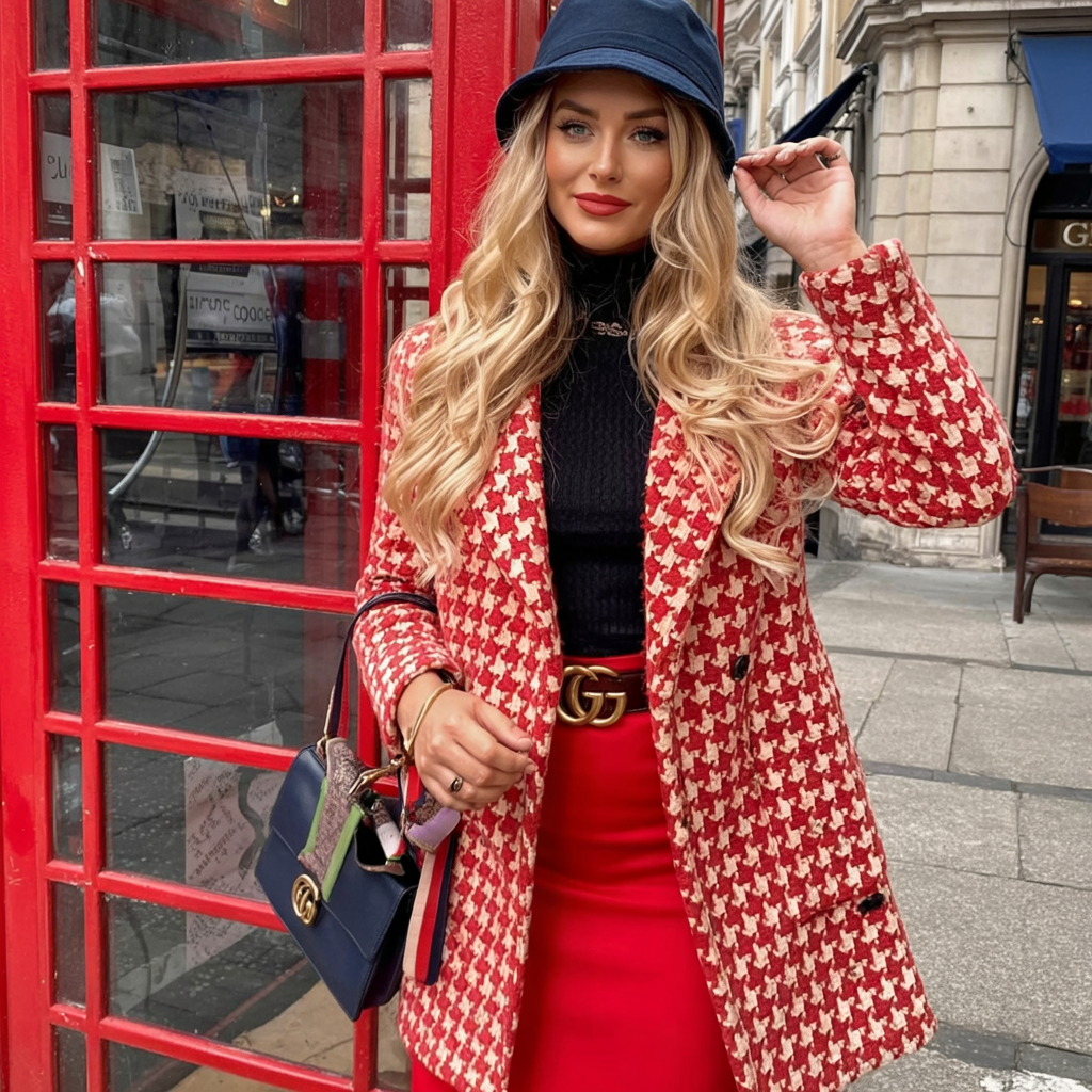 This outfit has a cool Brit-pop look and a little bit of 90s Spice Girl style. A mix of houndstooth blazer, poppy red skirt and a sleek black turtleneck makes a forceful combination that stands out. Pairing a bucket hat and a top-handle bag gives your look a playful and sophisticated look, like you’d wear for a walk in the city or an afternoon tea session.