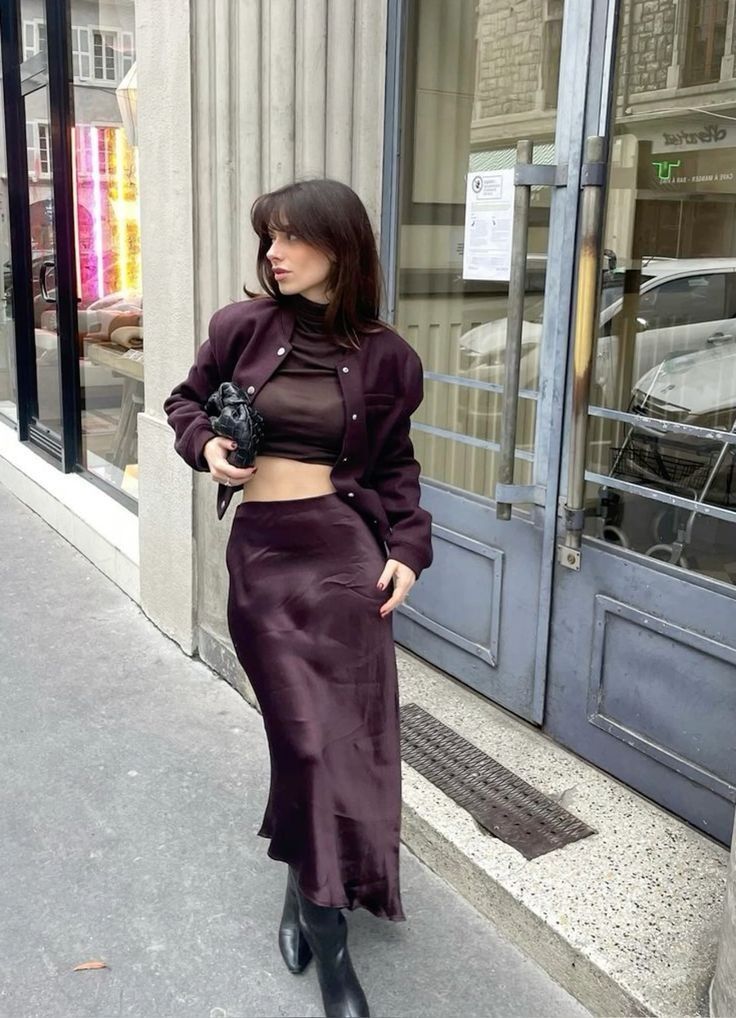Mixing fabric textures is a great way to make an outfit stand out. A velvet or silk midi skirt with a cropped jacket and black ankle boots creates a dressy chic look that’s both sophisticated and modern. Ideal for a winter dressy or date night ensemble, this look is timeless and chic.