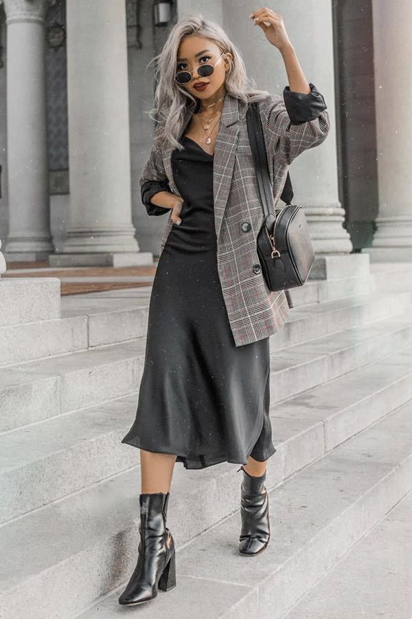 For a winter office look that exudes sophistication, pair black heeled ankle boots with a silky slip dress and a structured plaid blazer. The casual chic balance of fabric textures, from velvet to wool, makes it a great transition outfit from work to evening drinks. The structured fit of the blazer enhances the silhouette while the sleek black dress brings in an element of effortless elegance. Black accessories, such as a structured handbag and delicate gold jewelry, tie the look together. This outfit is also ideal for winter dressy occasions where you want to feel polished yet comfortable. Pairing suede boots instead of leather ones can also give this outfit a softened touch, perfect for transitioning into spring.