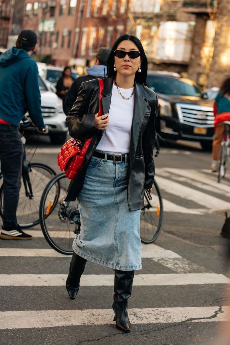For a casual chic take on denim, try a long denim skirt with a black leather blazer and black ankle boots. The contrast of textures makes this outfit a street-style favorite. Pair with a bold-colored handbag to add vibrancy to this fall casual or spring look. The structured leather blazer balances the relaxed feel of the denim, making it a statement ensemble. To keep the look fresh, choose accessories with metallic or leather details to complement the outfit’s texture play.
