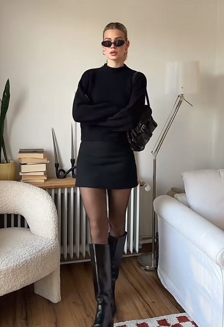 A black fitted sweater dress, paired with sheer tights and black ankle boots, makes for an effortlessly elegant outfit. Perfect for winter office settings, this look is chic yet comfortable. Minimal gold accessories add a touch of refinement. The sleek silhouette makes it easy to transition from day to night with just a change in accessories, like statement earrings or a bold clutch.