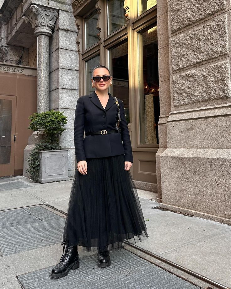A black tulle skirt with a structured blazer gives a dressy chic aesthetic, making it ideal for winter dressy occasions. The flat ankle boots keep it comfortable while adding a hint of punk attitude. Pair with a waist belt and gold jewelry for extra sophistication. The contrast between the delicate tulle and tailored blazer ensures the look remains balanced between romantic and structured.