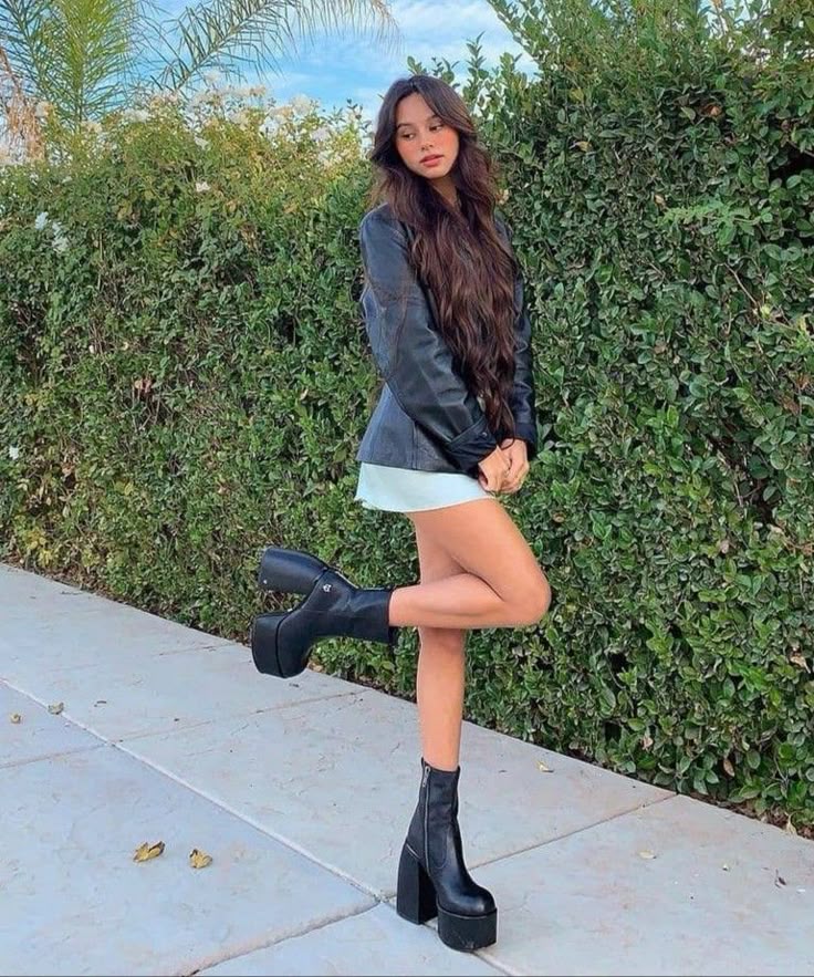 For a more dressy and playful vibe, pairing a mini skirt with an oversized leather jacket and heeled platform boots creates a bold yet feminine statement. The contrast between the structured chunky boots and the flowy skirt enhances the silhouette, making it perfect for fall casual outings or a spring date night. A fitted turtleneck or a lightweight flannel shirt can be tucked in for added warmth, making it adaptable for different season changes. Opting for suede or velvet boots adds a luxurious texture, perfect for transitioning from day to night. Throw in some minimal jewelry and a bold clutch bag to elevate the outfit even more. Whether heading to a brunch or an evening party, this look guarantees both comfort and standout appeal.