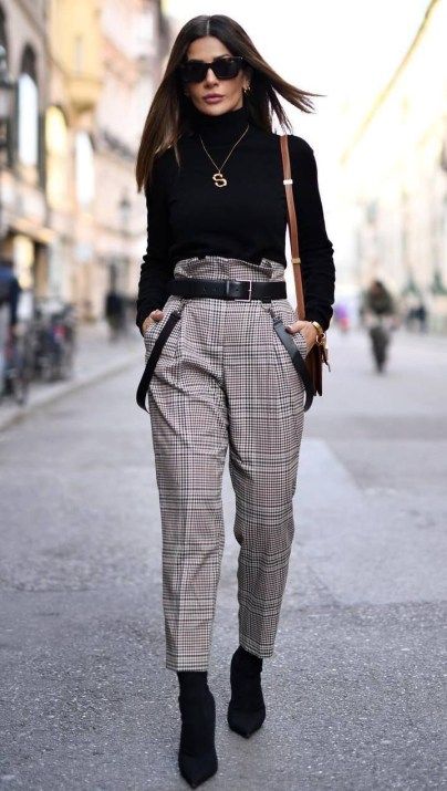 A classic workwear outfit, high-waisted plaid trousers paired with a black turtleneck and pointed black ankle boots, creates an elegant silhouette. This is an essential winter office or spring workwear outfit. Layer with a structured coat to complete the look. Minimalist accessories ensure the focus remains on the tailored details of the ensemble.