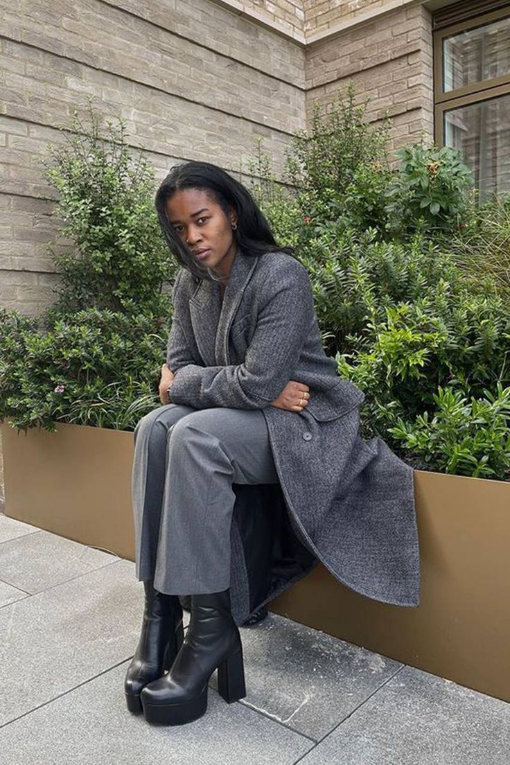 For a sophisticated winter office look, a long gray wool coat layered over wide-leg tailored trousers creates a refined, structured silhouette. The black platform ankle boots add height while keeping the outfit sleek and polished. The monochromatic palette gives a sense of elegance, making this ensemble a winter dressy must-have. The fabric choice, from structured wool to soft knits, enhances the depth of the look. A minimalist handbag and delicate gold jewelry complement the neutral tones, ensuring the outfit remains stylish yet understated. For a casual chic alternative, swap the coat for a flannel blazer and the trousers for high-waisted jeans.
