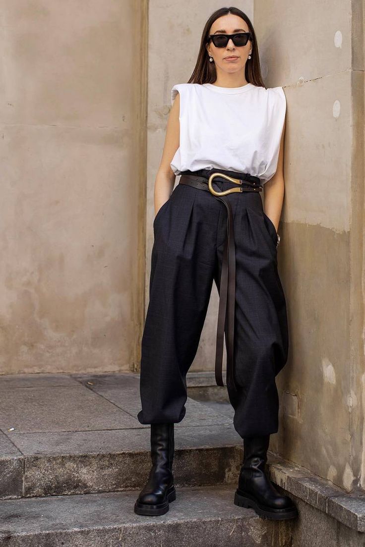 For those who love a casual jeans alternative, wide-leg denim or tailored trousers paired with a structured belt and flat black ankle boots is the way to go. This outfit embodies the perfect balance between relaxed and polished, making it suitable for everyday wear. The high-waisted fit of the trousers elongates the legs, while the chunky boots ground the look with an effortless appeal. A tucked-in basic tee or a sleeveless turtleneck enhances the structured aesthetic, making it ideal for winter office looks. To add a bit of layering, a lightweight fabric trench coat can be worn over the ensemble, offering warmth without compromising style. Whether styled with a crossbody bag for a day of errands or accessorized with leather gloves for a more refined appearance, this outfit seamlessly blends into 2025’s fashion trends.