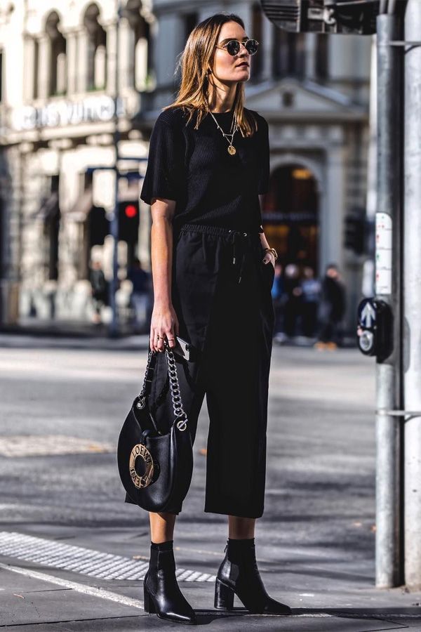 For an elegant approach to winter casual, an all-black ensemble featuring cropped black trousers and heeled ankle boots exudes sophistication. This look is effortlessly dressy chic, making it ideal for both work and after-hours engagements. The cropped fit of the trousers allows the boots to shine, making them the statement piece of the outfit. Layering a fitted high-neck sweater with a structured blazer enhances the sleekness, while a long coat can be added for extra warmth. Suede or leather boots with subtle embellishments or pointed toes elevate the aesthetic even further. Minimalist jewelry and a classic tote bag complete the ensemble, keeping it stylish yet professional. Whether worn in the autumn months or on a chilly winter day, this all-black look remains timeless.