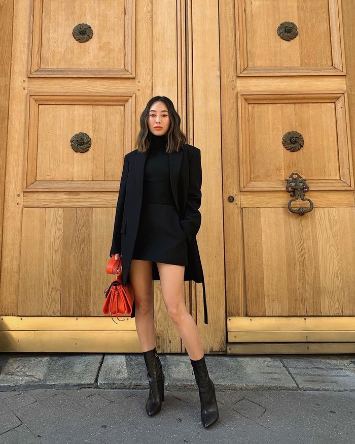 Pairing black ankle boots with a vibrant orange turtleneck sweater and a structured black blazer creates a stunning contrast that makes this outfit ideal for winter dressy occasions. The mini skirt with a side slit adds a touch of allure, while the chunky lace-up boots provide a strong foundation for a modern winter casual look. Accessories like oversized sunglasses and a patterned handbag give the outfit a high-fashion edge. This ensemble effortlessly balances bold and elegant, making it perfect for work, events, or city outings. To adapt this outfit for spring, swap the turtleneck for a lighter knit top while keeping the black blazer as a layering piece.