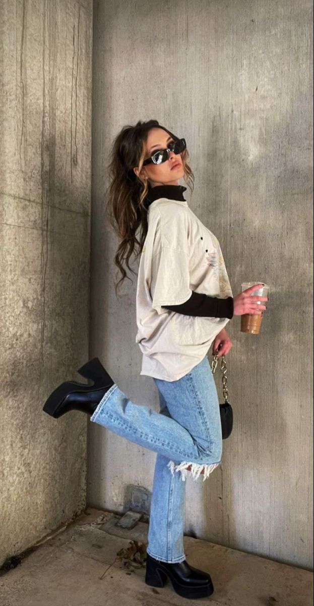 For a casual chic look with an urban edge, layering an oversized flannel or vintage tee over a turtleneck and pairing it with casual jeans and platform ankle boots creates an effortlessly cool outfit. Ideal for 2025 street-style fashion, this look embraces both practicality and boldness. Pair it with oversized sunglasses and a slouchy bag to amplify the autumn aesthetic.
