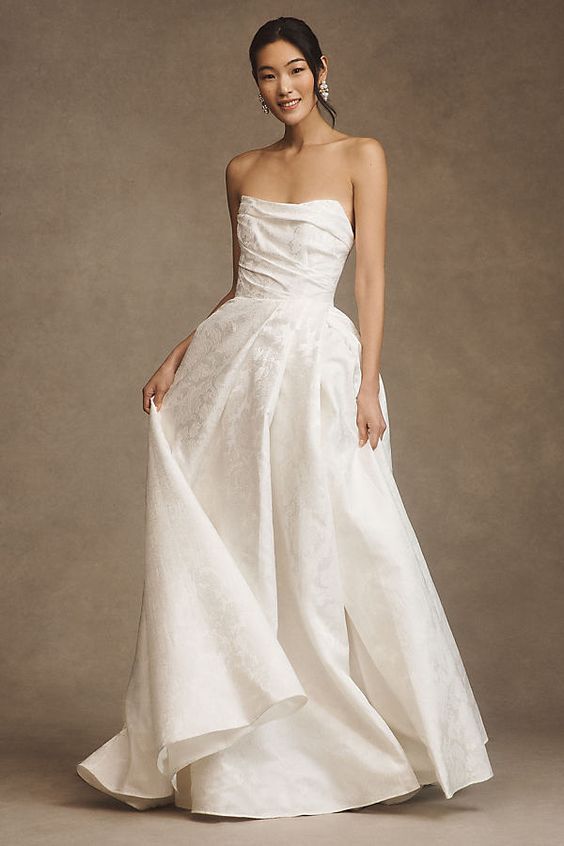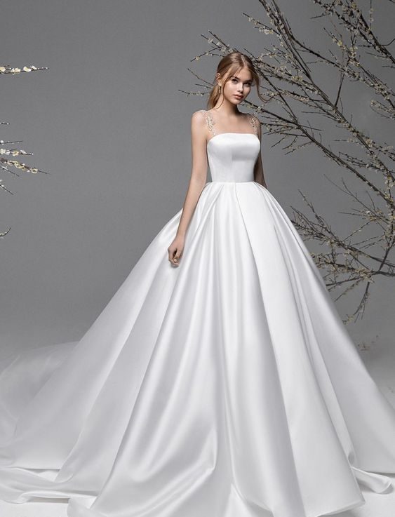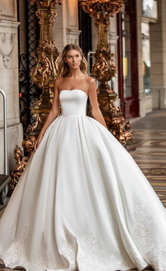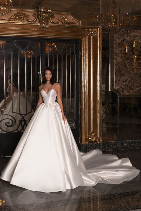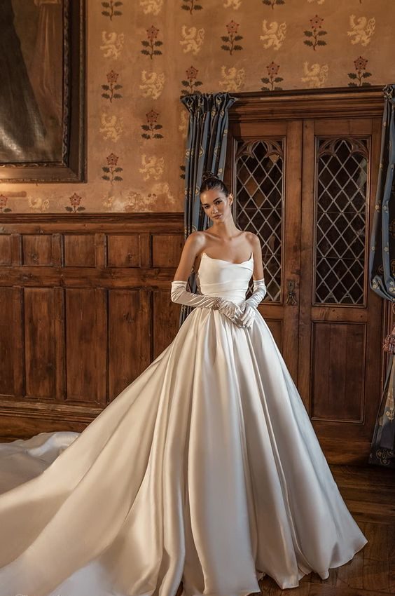 Here is a bridal look that exemplifies minimalism with maximum impact. This princess wedding dress features clean lines that carve out a statuesque profile. It’s a testament to the power of simplicity, and its unadorned surface makes it a canvas for personal expression through accessories or a dramatic veil.