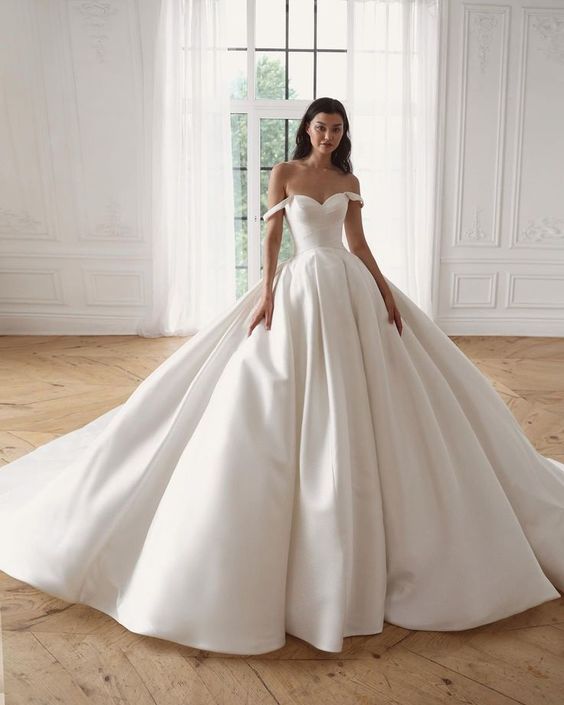 This princess wedding dress off shoulder style captivates with its minimalist design, flowing into a majestic ball gown skirt. The delicate balance of simplicity and volume makes this dress a timeless choice for modern brides seeking a touch of regality.