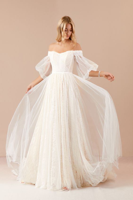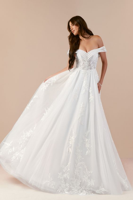 The princess wedding dresses off shoulder come to life in this gown with its intricate lace detailing and romantic off-shoulder sleeves. The dress is a canvas of exquisite artistry, with a full skirt that adds to the fairytale allure—a nod to the ball gown fairytale dreams every bride harbors.