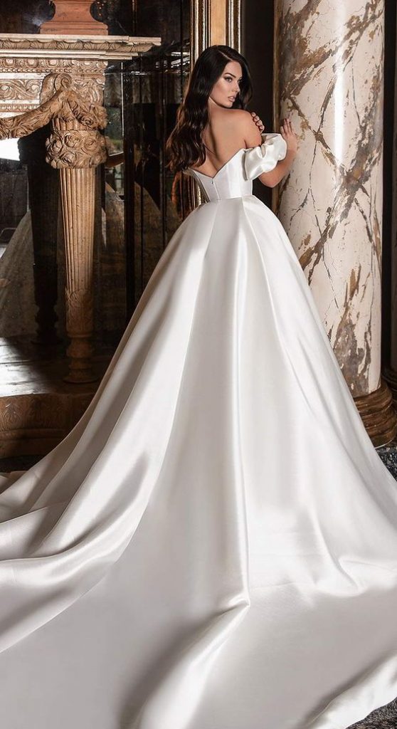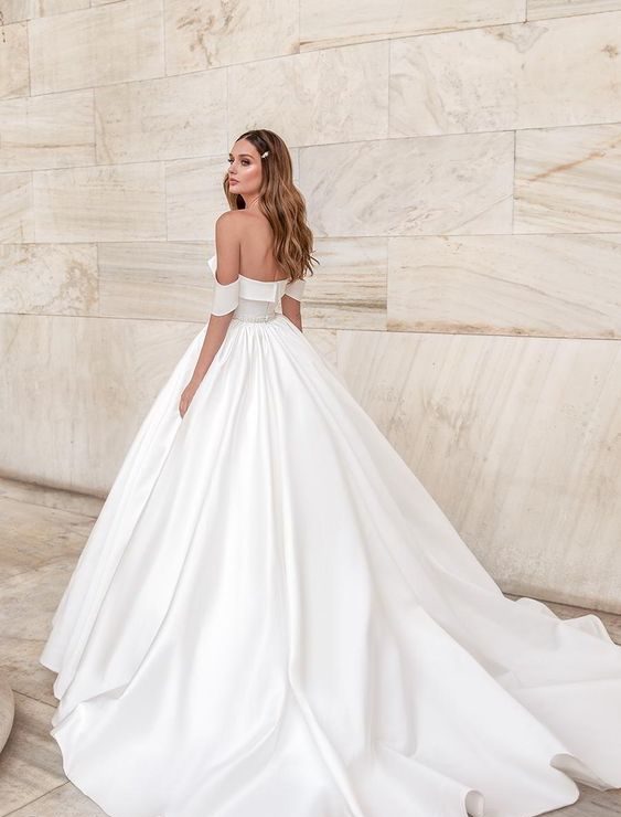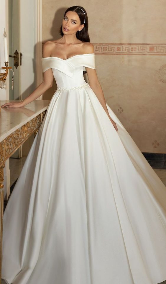 The gown depicted brings to life the classic allure of satin, styled in a sensuous silhouette that celebrates the feminine form. Its sweeping train and off-shoulder accents make it a princess wedding dress off shoulder that combines both sophistication and romance. The fluidity of the satin adds a dynamic grace, hinting at a regal yet intimate celebration.