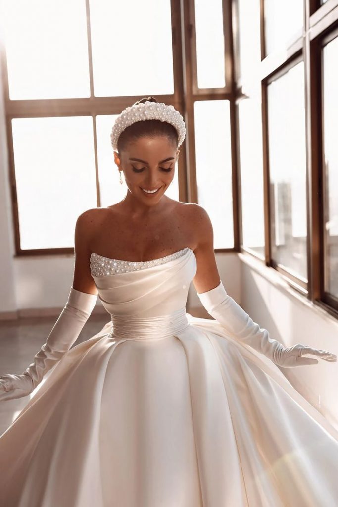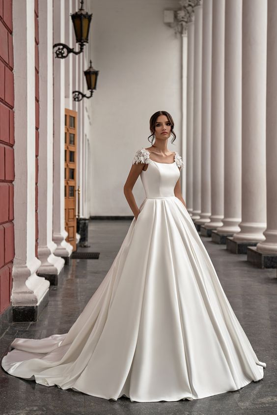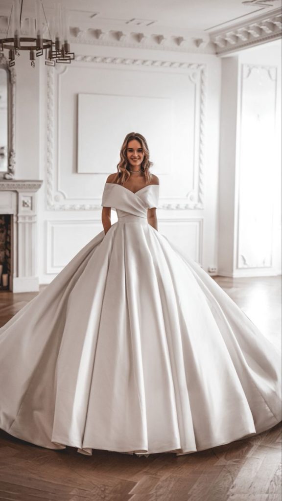 Our journey begins with a vision in satin. This exquisite princess wedding dress is the epitome of grace and simplicity. Its flawless structure and the gentle sheen of the fabric embody the essence of modern royalty. The dress’s classic off-shoulder neckline elegantly frames the bride, adding a soft, yet empowering allure to the gown’s silhouette.