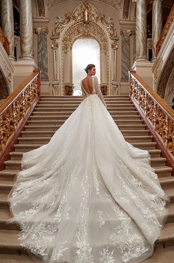 Here, the gossamer threads of romance are spun into a gown. The princess wedding dresses with sleeves capture an aesthetic that combines the demure with the alluring. Delicate off-shoulder sleeves add a touch of whimsy, while the lace whispers tales of antique love stories, creating an ambiance of delicate romance.