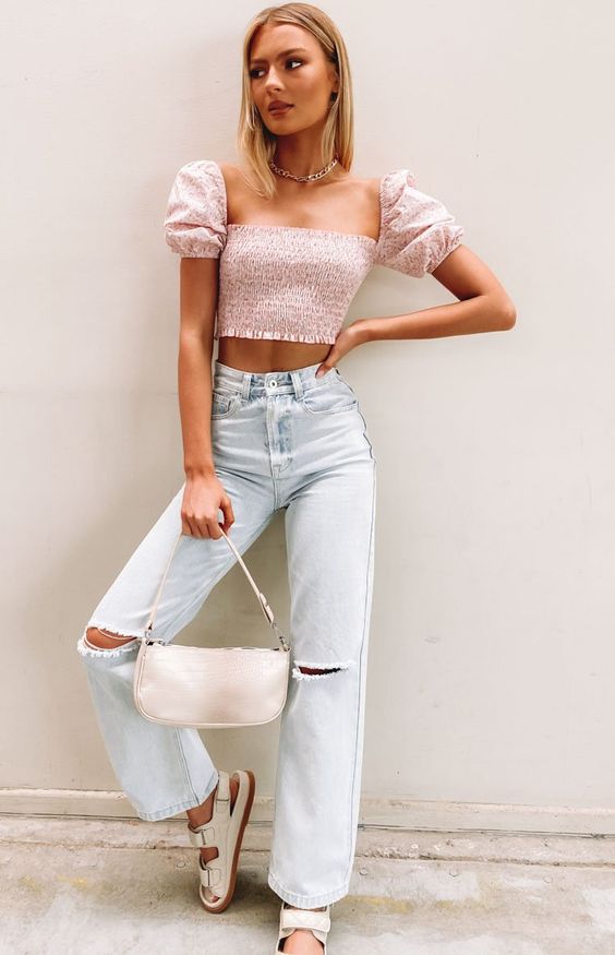 With a nod to the past, this rosy textured crop top with puff sleeves adds a touch of vintage charm to the modern mom jeans. This combination speaks to the jeans with crop top ideas that are both nostalgic and fashion-forward.