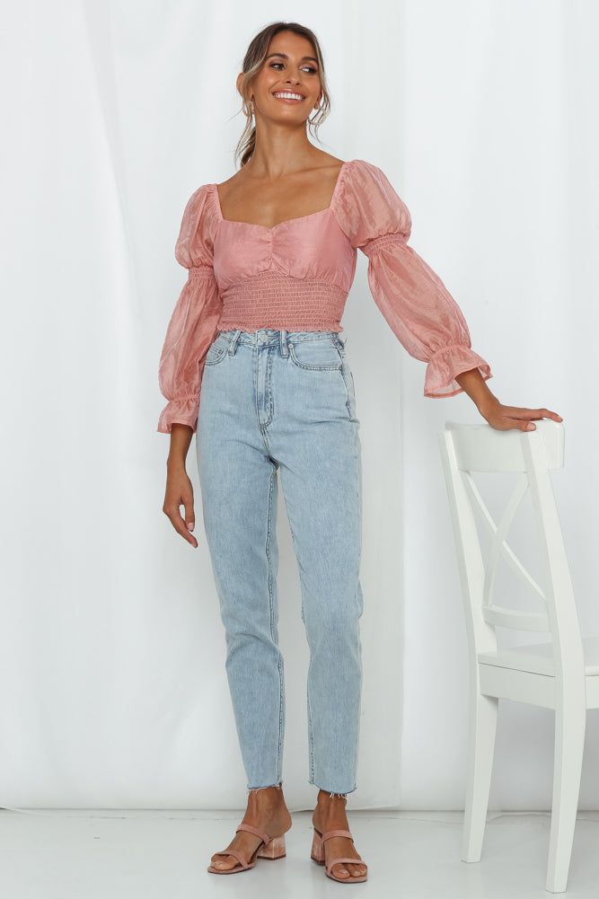 Dreamy and delicate, the candyfloss pink crop top with sheer sleeves adds a playful yet sophisticated air to these snug jeans. It’s a sweet twist on the jeans with crop top trend.