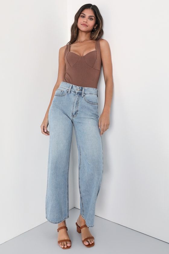 Here’s where the tailored meets the relaxed—a structured brown crop top melding with comfortably wide leg jeans. This outfit challenges the norms, giving a nod to the power-dressing woman who appreciates the high waist advantage.