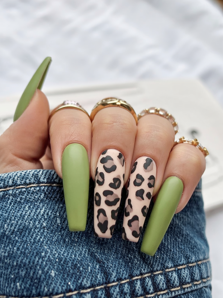 Soft green collides with soft leopard in this down to earth editorial-inspired work. The contrast that is made between the sage tips and leaf-toned spots makes it a fresh-from the nature feeling but at the same time high so that you feel like you are entering into a modern art gallery in your favorite linen jumpsuit.