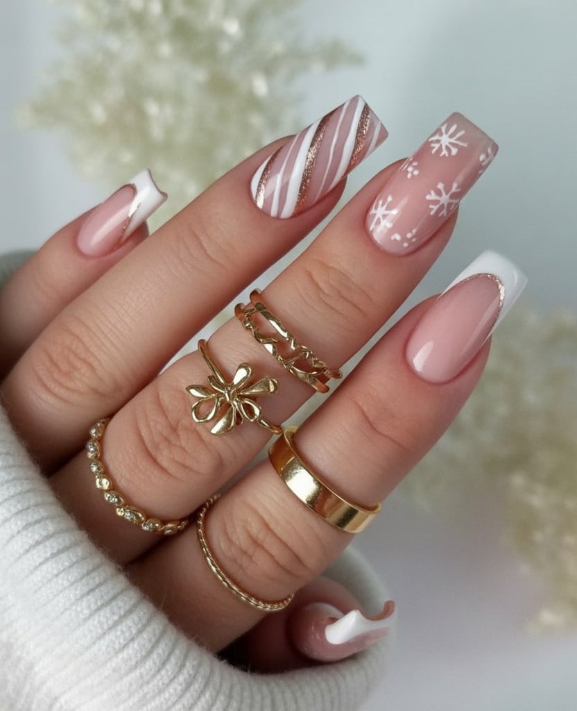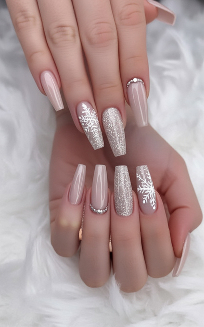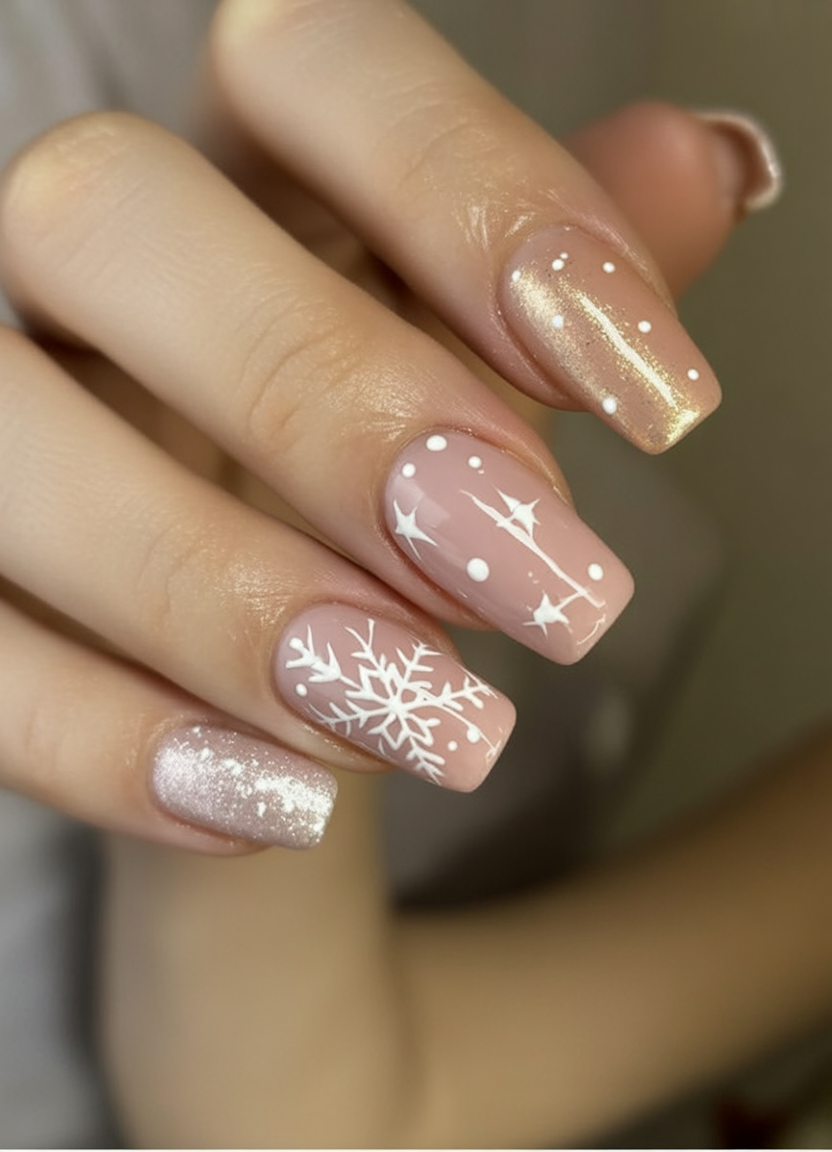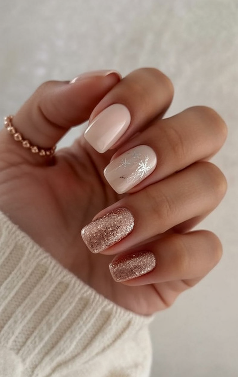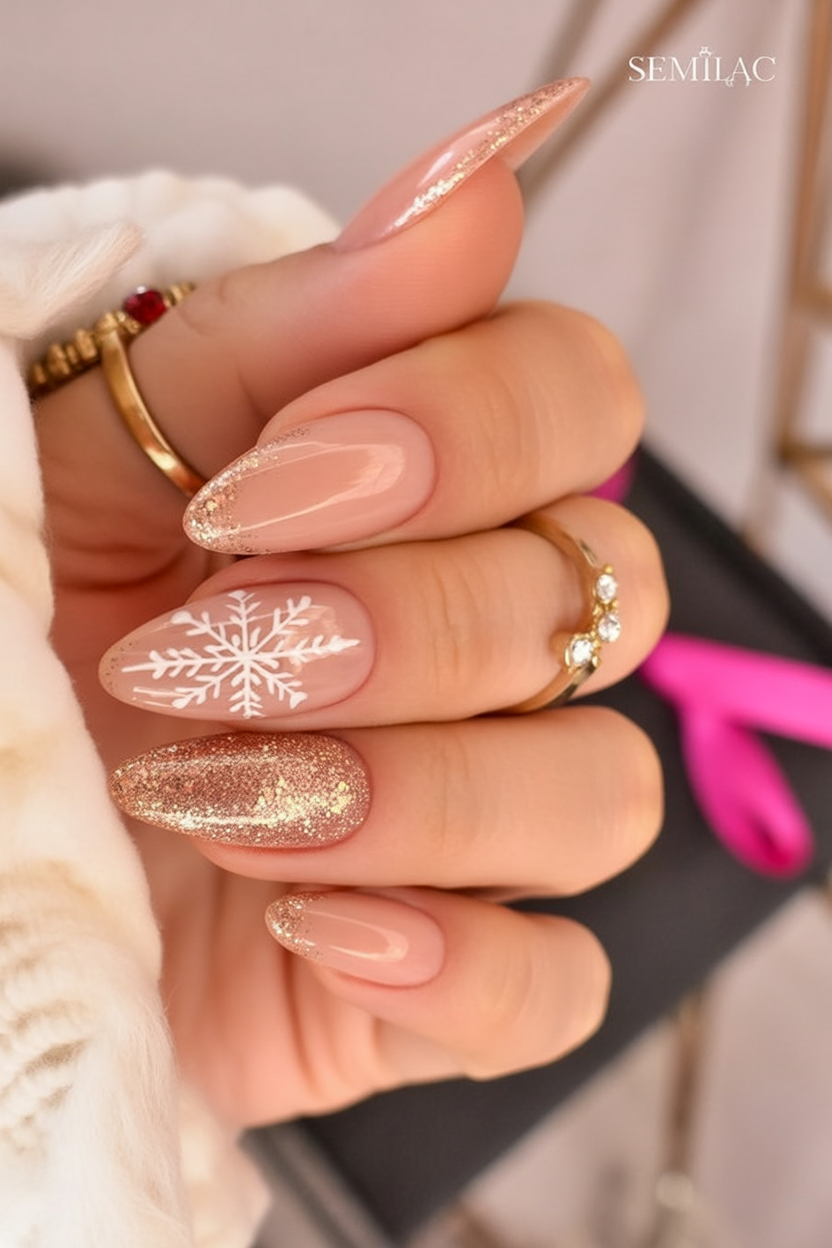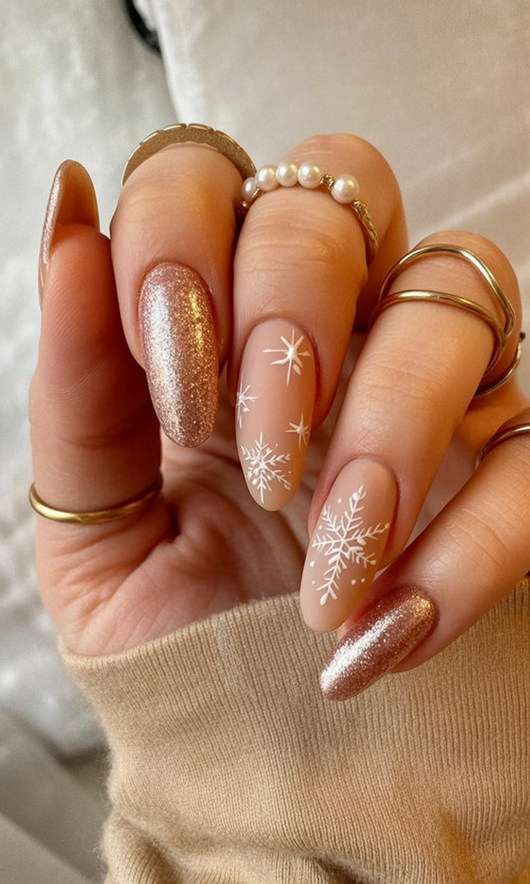 Sometimes, a touch of rose gold is all you need to make your manicure feel special. This design mixes a warm nude base with glittery rose gold accents and soft snowflake detailing, creating a look that feels both cozy and chic. It’s a perfect match for gold jewelry or warm winter tones, and it adds that bit of sparkle without being overwhelming.