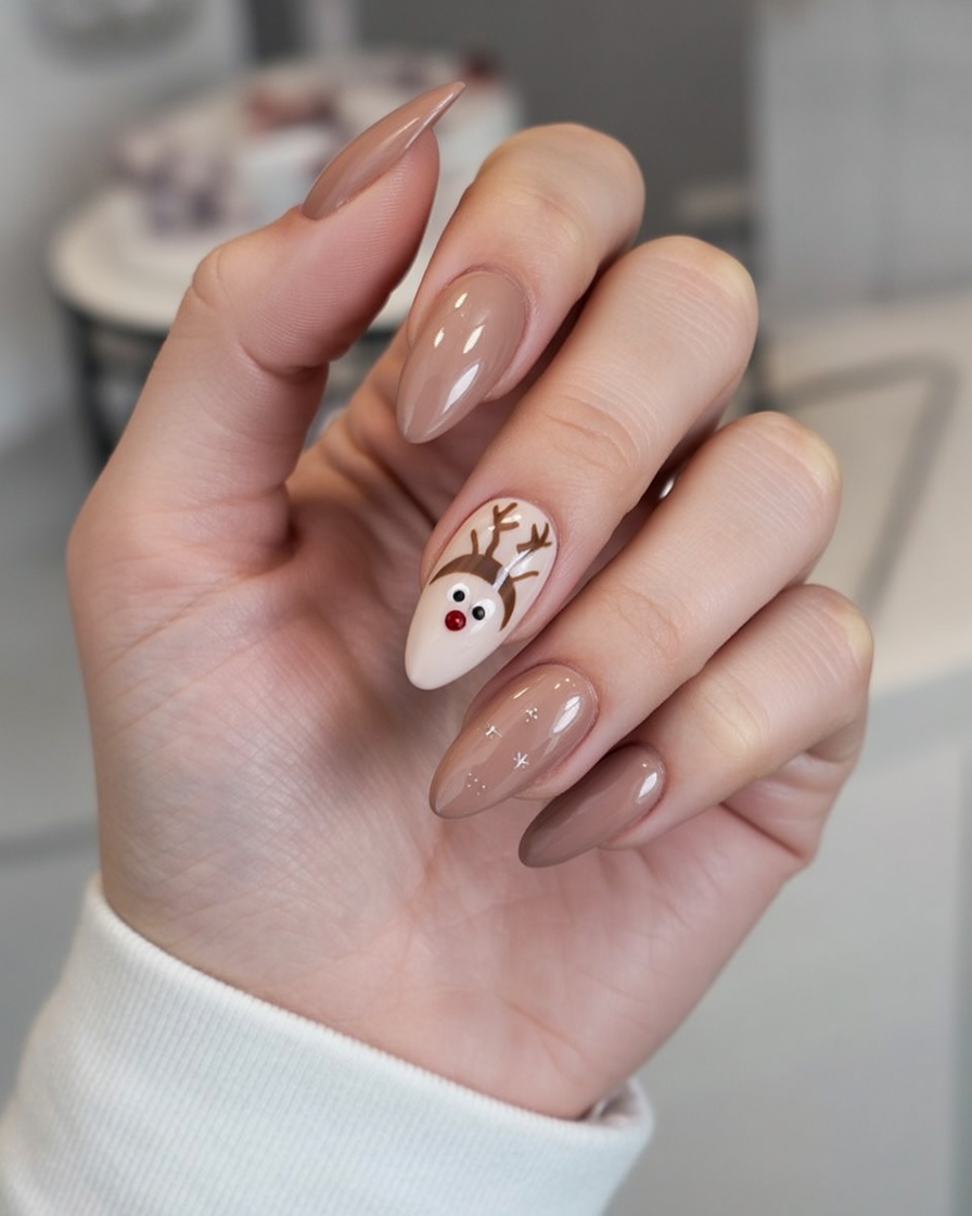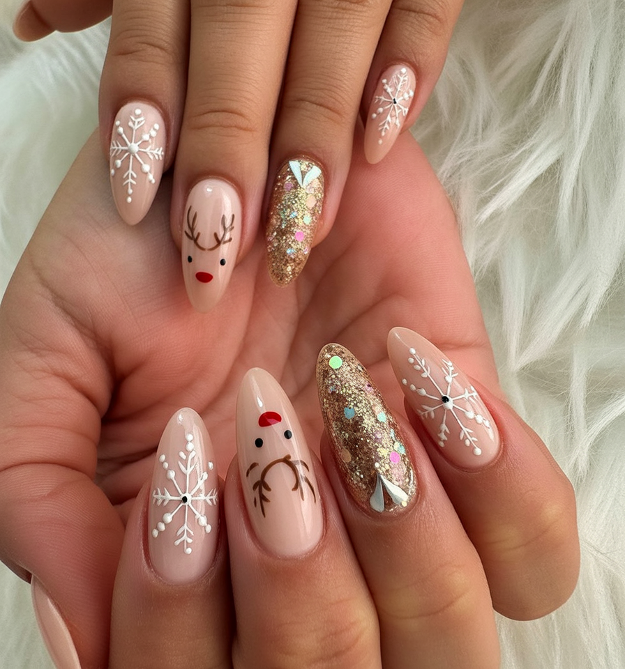 If you love acrylic almond or oval nails, this design will give you the perfect festive vibe. The combination of simple snowflake accents with bold glitter and reindeer details makes it one of the most fun Christmas ideas for 2025. It’s ideal for women who love adding a little humor and joy to their style.