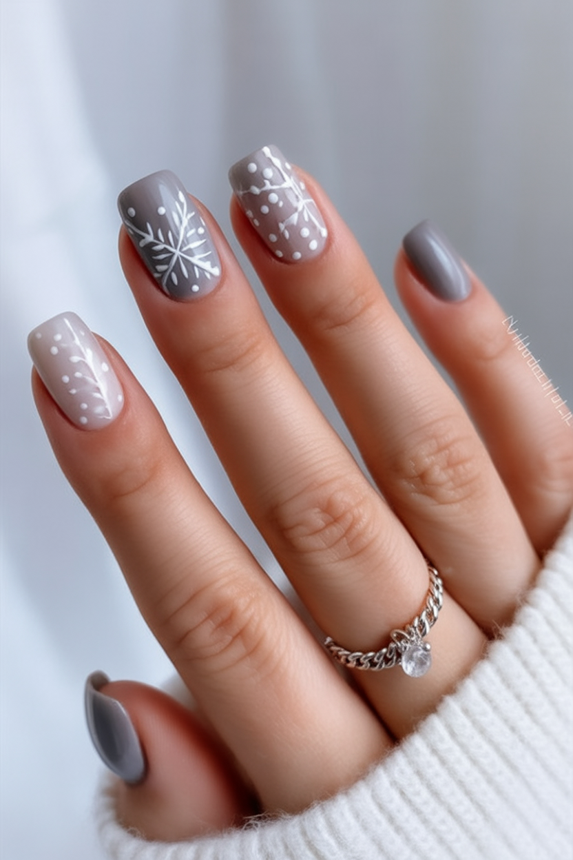 If nail art could translate serene winter mornings into a design, that would be it. Gradually fading hues of soft grey with snowflakes and dotted accents conjure images of frost settling on a pane of glass. Such minimalistic yet captivating charm strikes a wonderful balance between modern flair and holiday spirit.