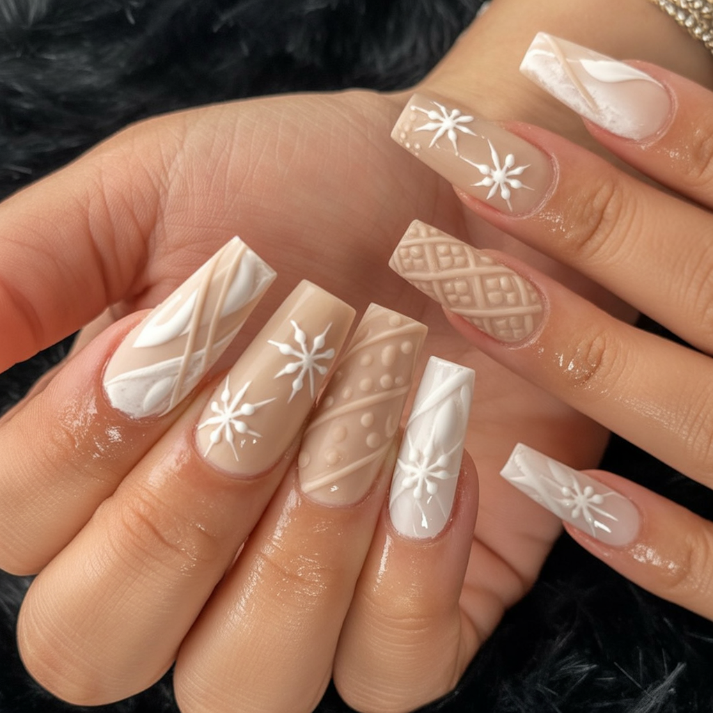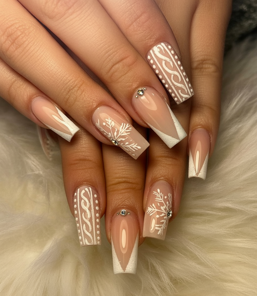This design takes the coziness of a holiday sweater and brings it to your fingertips. The neutral base paired with intricate sweater-like textures, rhinestone accents, and French tips feels festive yet elegant. It’s warm, stylish, and perfect for the holiday season.