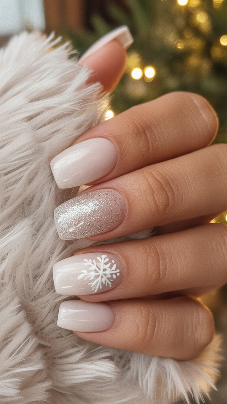 These nails give off the same cozy feeling as sipping a latte by the tree lights. With a neutral nude base, a dusting of shimmer, and a soft snowflake accent, they manage to feel both subtle and festive. It’s a frosty, glowing design that looks elegant in every setting — from a holiday dinner party to a casual coffee run.