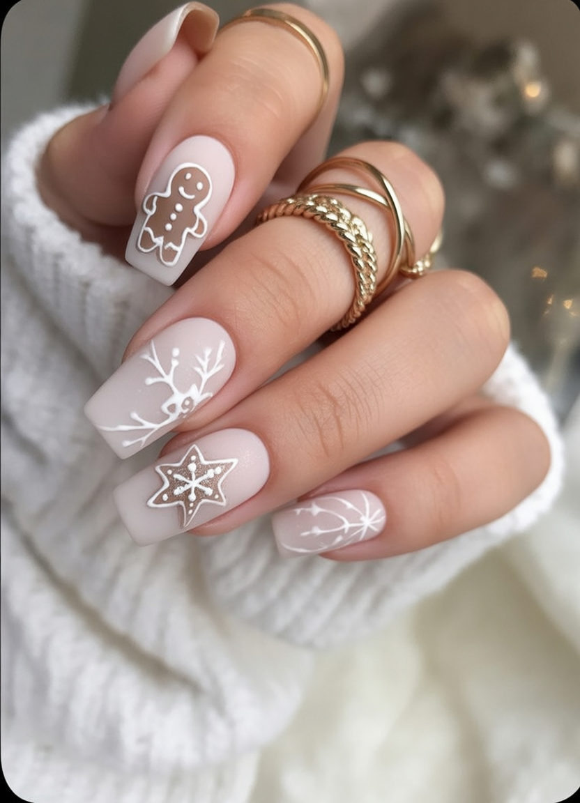 Nothing quite makes one feel nostalgic like a gingerbread cookie, and this manicure is an encapsulation of that memory. The warm neutral base allows the sweet gingerbread man to stand out nicely, dressed with snowflake and star details that allow the look to stay playful and elegant at the same time. It is festively charming, however, in the storybook sort of way, which is exactly the type of design to make you smile every time you glance at your nails.