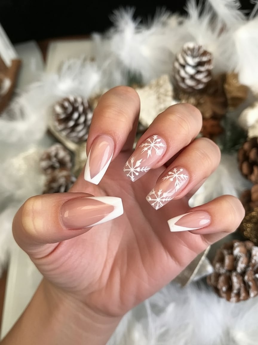 This design is where classic French nails meet holiday magic. The white tips are very crisp, sleek, and clean, while the snowflake accents add a playful Christmas twist. It is a very modern yet chic expression of an age-old style, perfect for day wear and glammed-up evenings alike.