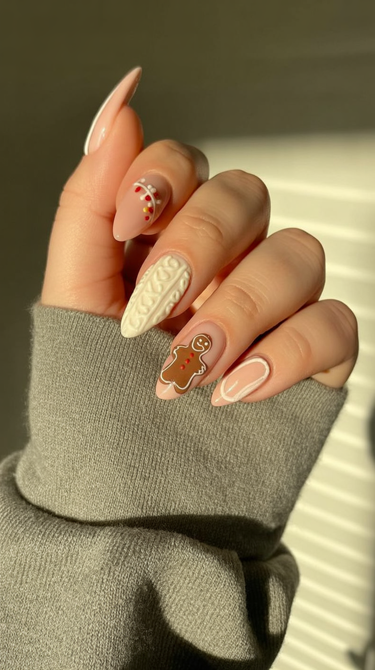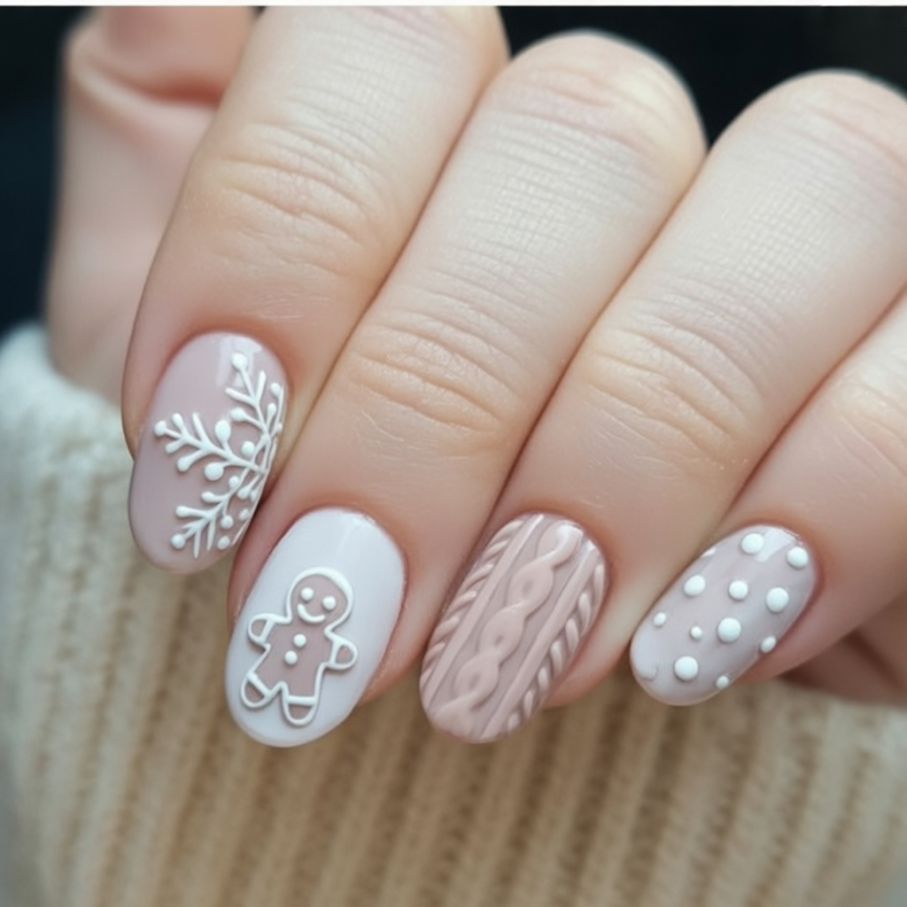 Imagine stepping into some wintertime fairytale with all the charm this design emits. There is a gingerbread man, cosy sweater-inspired patterns, snowflakes, and dots: each nail tells a different tale. Whimsical, charming, and downright fun-a set that instantly imparts Christmas spirit to sorry looking nails.