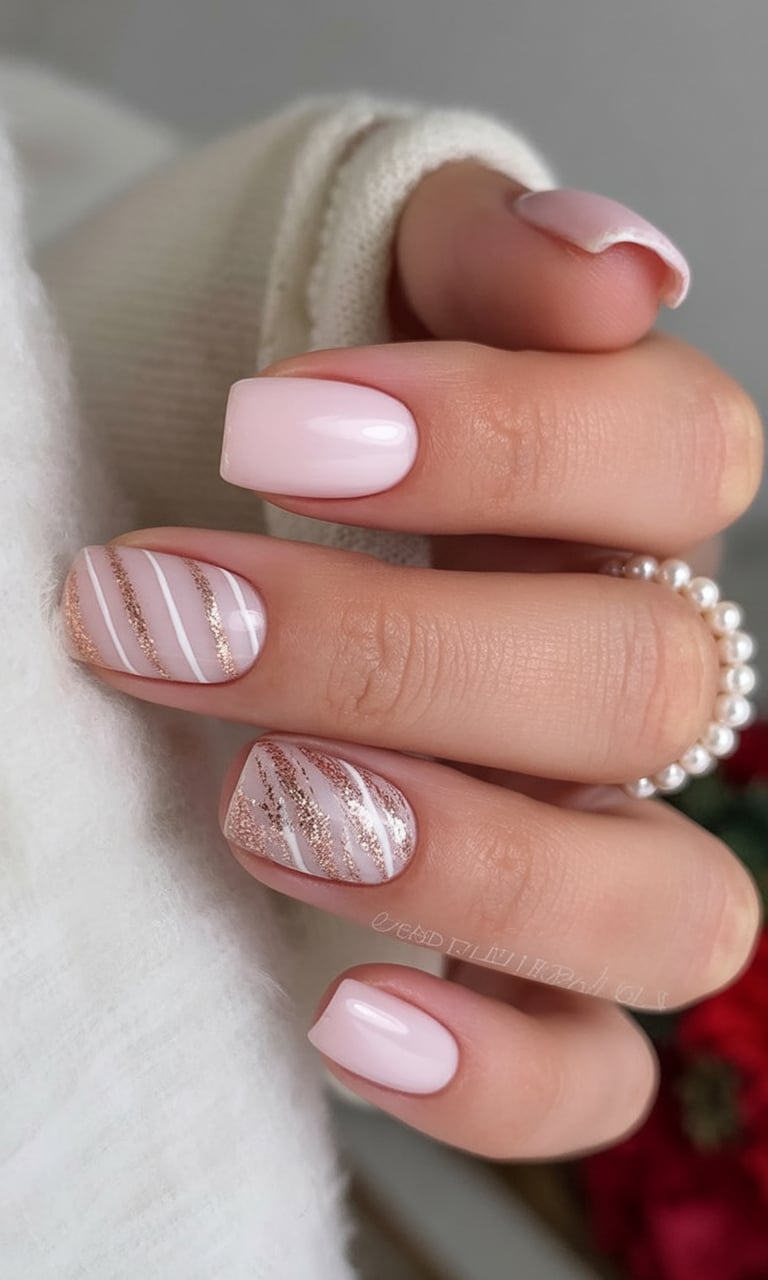 Instantly chic, this manicure combines a pale blush base contrasted by candy-cane-inspired stripes in metallic rose gold. It is for real: fresh and festive, but without all that noise. It is the sort of nail art that looks good with every outfit, from your comfy knitwear to your graceful holiday dresses.