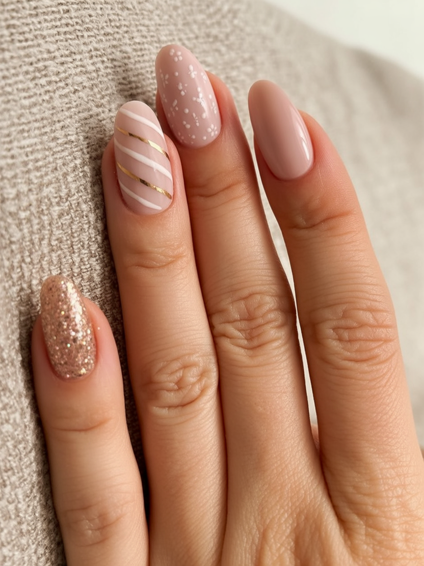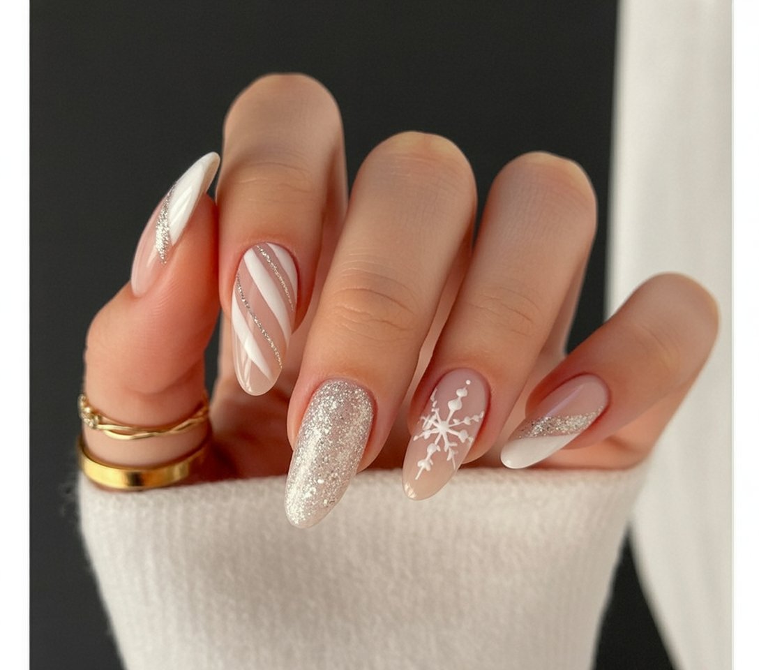 This manicure charms with a very subtle sweetness that is both modern and festive. The nude base keeps it fresh and minimal, while golden glitter stripes and speckled accents nod to holiday charm in the most understated way. It’s like candy canes reimagined in chic neutrals — perfect for women who prefer elegance over boldness.